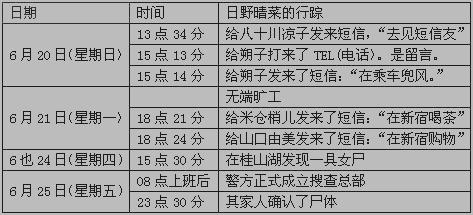 在网站中,警方也获得了晴菜自己登录网站时,提供的个人资料。根据这些,就应当知道晴莱最近和谁,有着频繁的接触,她在和家人失去联系的星期日——即6月20日,至次日星期一——即6月21日,晴菜本人究竟在什么地方。